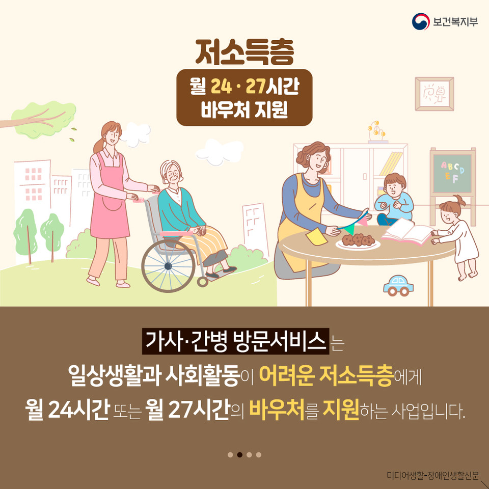 가사·간병 방문 지원사업은 일상생활이 어려운 저소득층 가정에 필요한 간병 및 가사 서비스를 제공하여 그들의 생활 안정을 도모하고 사회적 일자리를 창출하는 프로그램입니다.