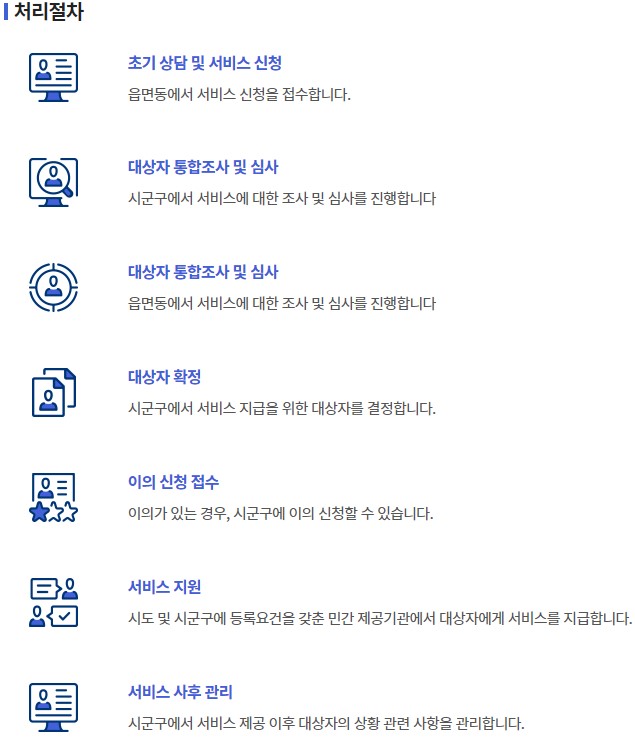 초기 상담 및 서비스 신청, 대상자 통합조사 및 심사, 대상자 확정, 이의 신청 접수, 서비스 지원, 서비스 사후 관리 순으로 진행됩니다.